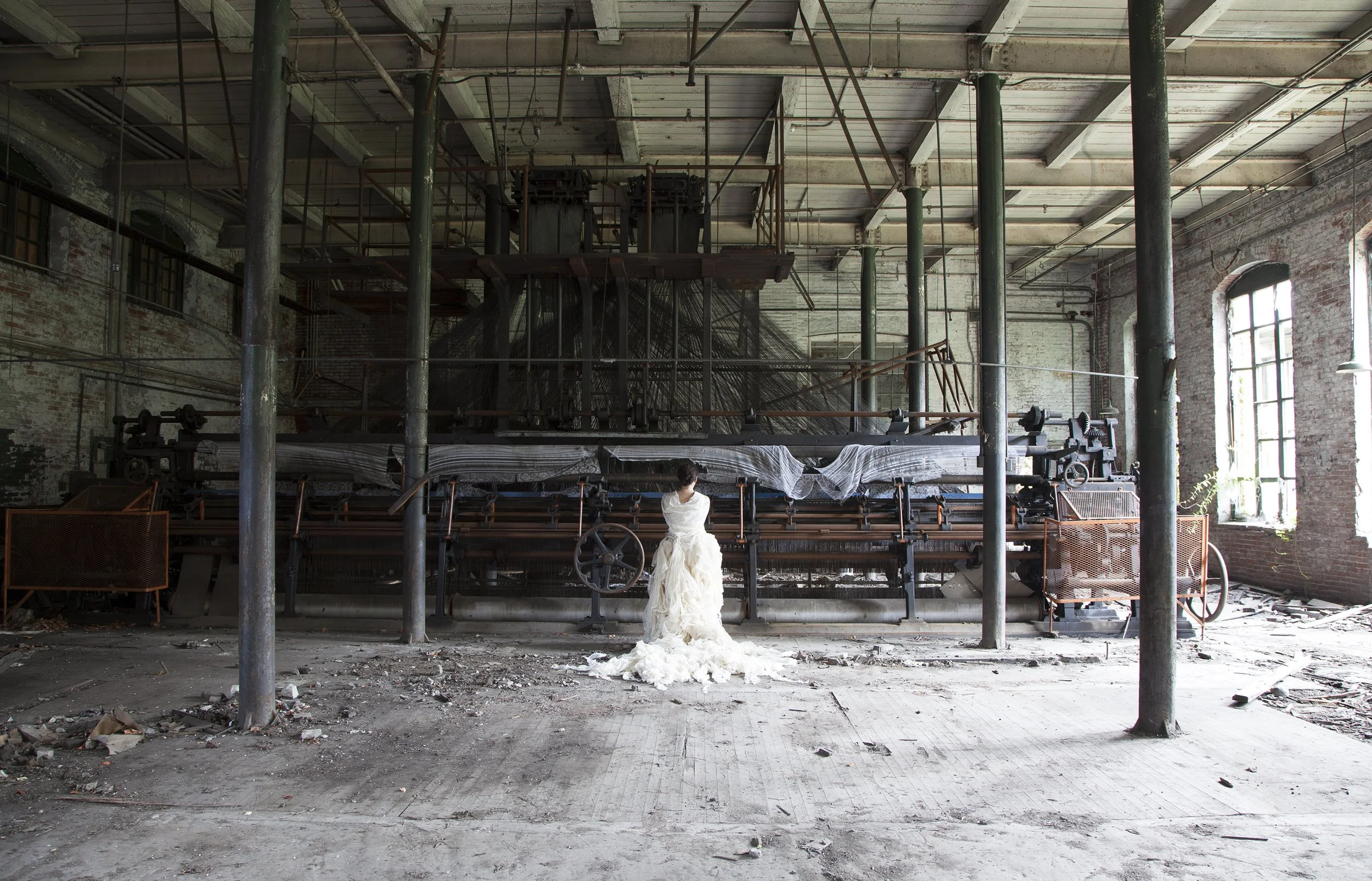 Climb the narrow stair and the temperature shifts. The upstairs rooms carry the post‑industrial works, where cloth and labor and the afterlife of factories provide the ground. In Weaver with Plant, a solitary figure faces a vast, idle loom in a decayed mill. The gown reads like unspooled fiber. Dust holds the light. The machine occupies most of the frame. The imbalance is deliberate. The photograph honors the scale of industry and refuses to lose the human scale within it. Attention becomes a kind of work.