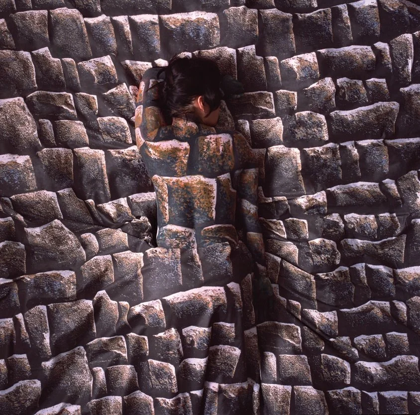 Then a stone wall arrives. The body presses into oversized cobbles, paint and fabric echoing grit and frost. The illusion holds until the fabric buckles, and at that buckle the person steps forward again. I kept reading those small ruptures as acts of care. A pattern that fits too perfectly begins to swallow its wearer. A pattern that breaks a little leaves room for breath.