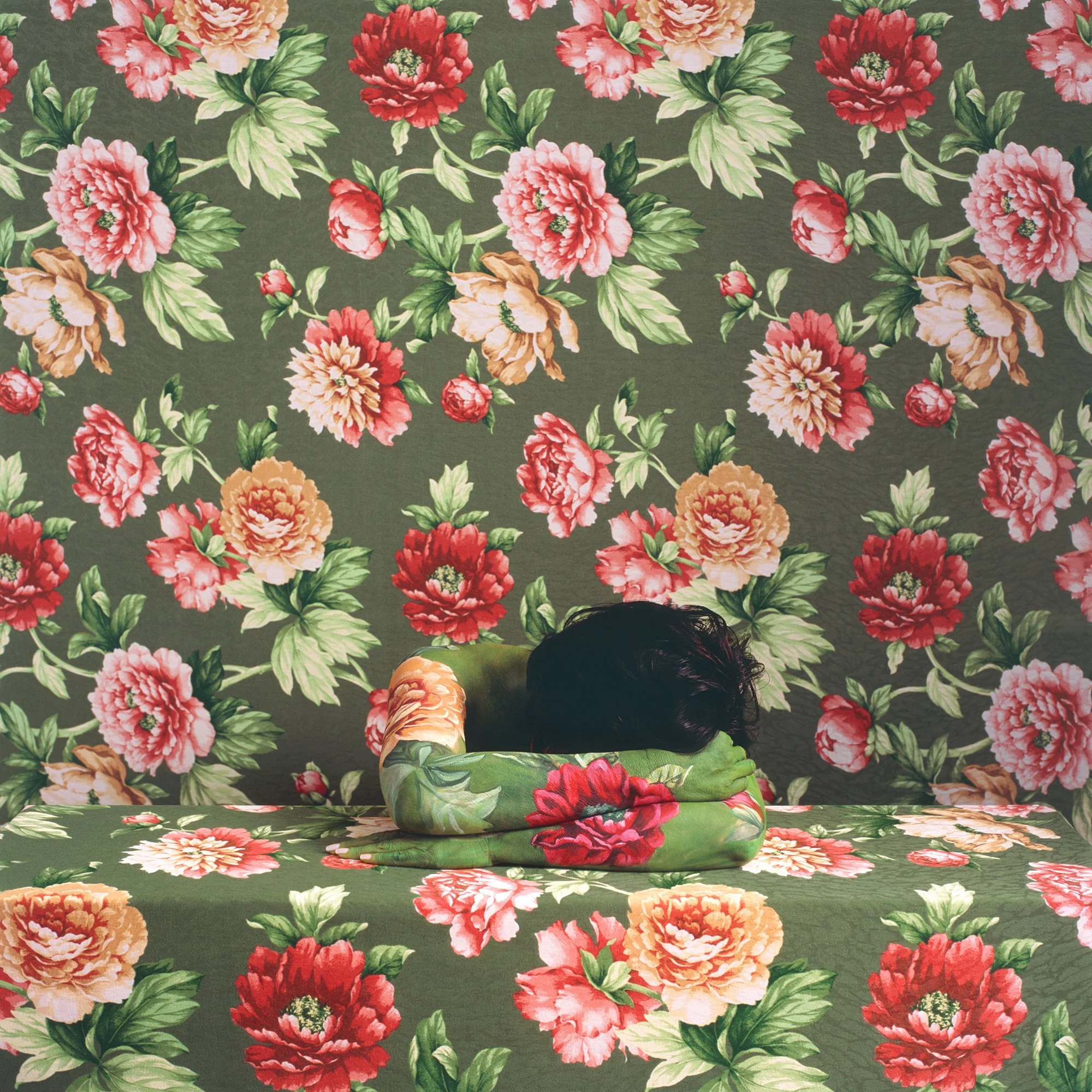 A close view gives another lesson. Crossed forearms lie on a dark floral textile. Veins become vines. Petals migrate from cloth to skin and back again. It is quiet work, almost devotional. Your attention slows to meet it. The photographs undo the neat split between nature and the manmade. Pattern is not just decoration. It is a second skin that insists on touch, labor, memory. The figure looks back and the room turns into a place for negotiation. Identity is not a badge you put on in the morning. It is a daily treaty with what surrounds you.