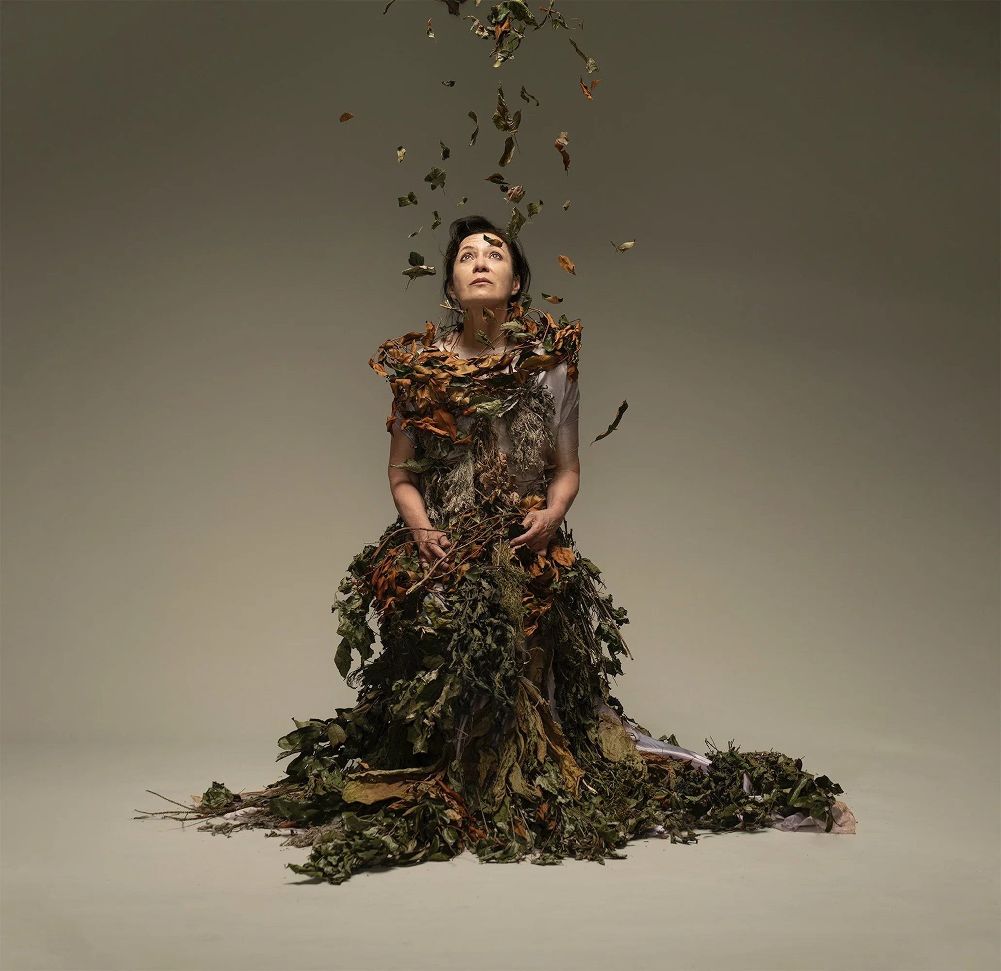 Wisdom condenses the upstairs mood into an emblem. A sculptural dress made of dried leaves rustles in a studio. Loose leaves fall from above. The face turns upward with calm intent. Seasons have been stitched into a garment. Time becomes material you can wear. I read it as a promise. Salvage can be art. Decay can feed form.