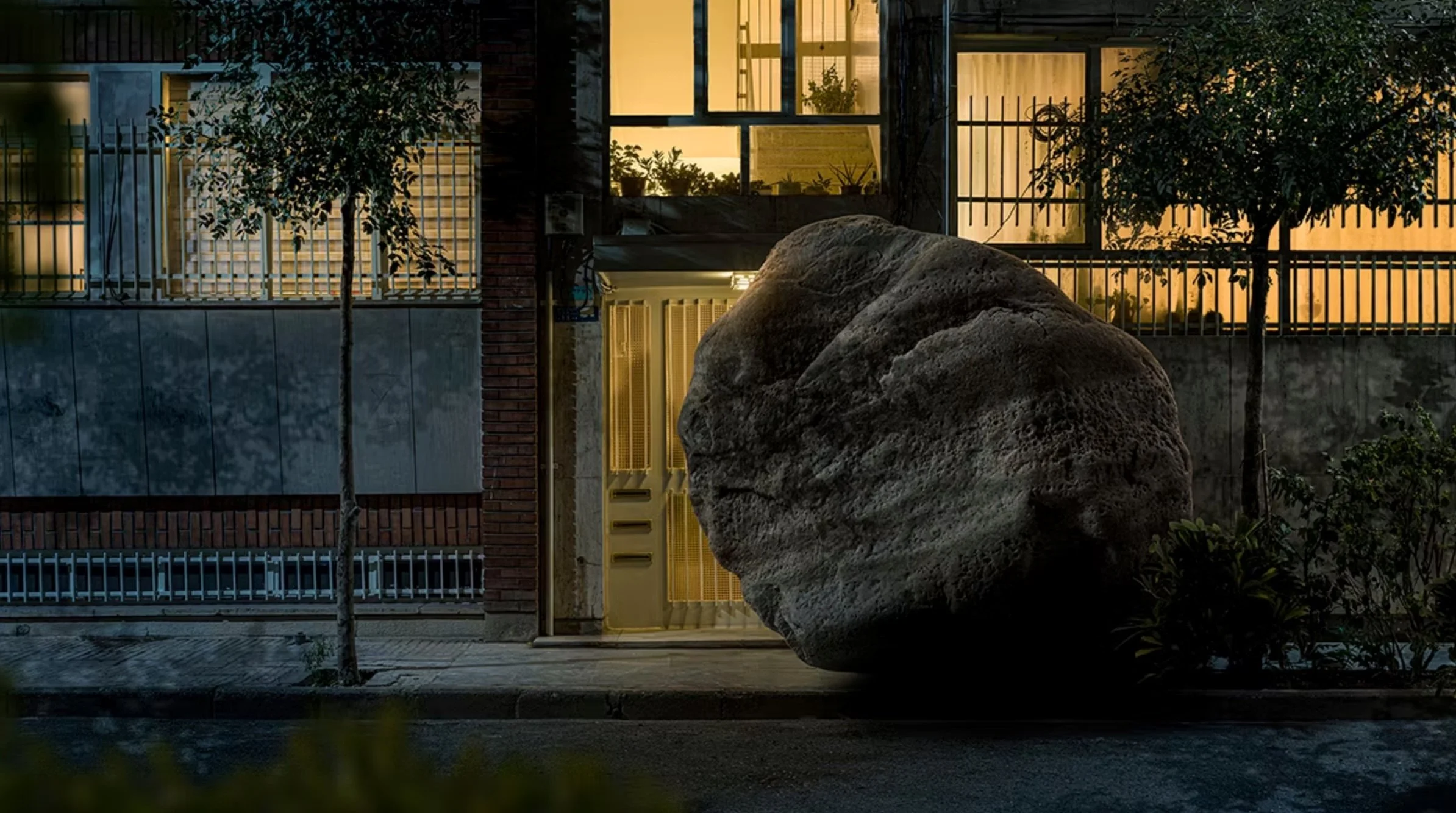 Each photograph in the series is a scene of domestic entrapment, made uncanny by the presence of a boulder lodged without ceremony into kitchens, living rooms, bedrooms. The stone doesn’t break through; it dwells, carved into the silence like a lodger no one invited, no one can evict. It is the aftermath of something unspoken. The embodiment of what refuses to move on.